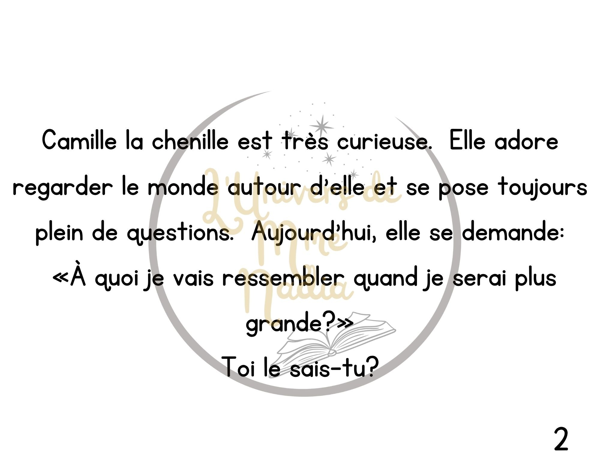 Ce kamishibaï raconte l’histoire de Camille la chenille, une petite chenille très curieuse qui se pose toujours beaucoup de questions. Cette fois, elle s’interroge : «Quand je deviendrai un papillon, de quelle couleur seront mes ailes ? » Si mon